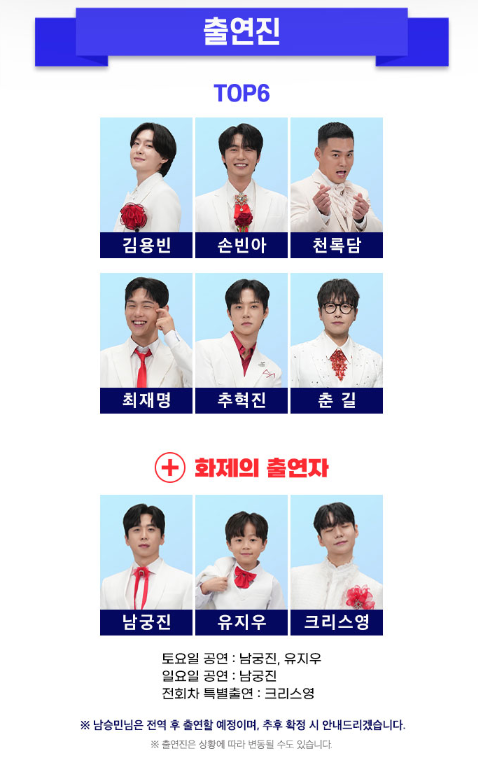 - TOP6 멤버: 김용빈, 손빈아, 천록담, 최재명, 추혁진, 윤길