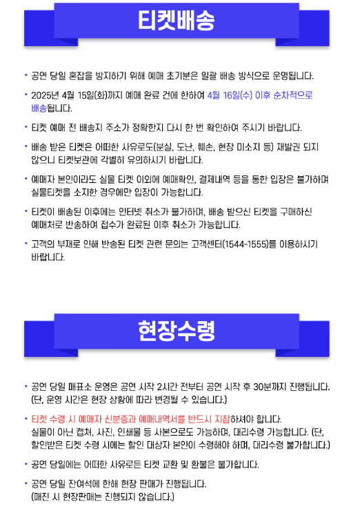 - 현장수령: 공연 2시간 전부터 가능 (신분증 & 예매내역 필참)
