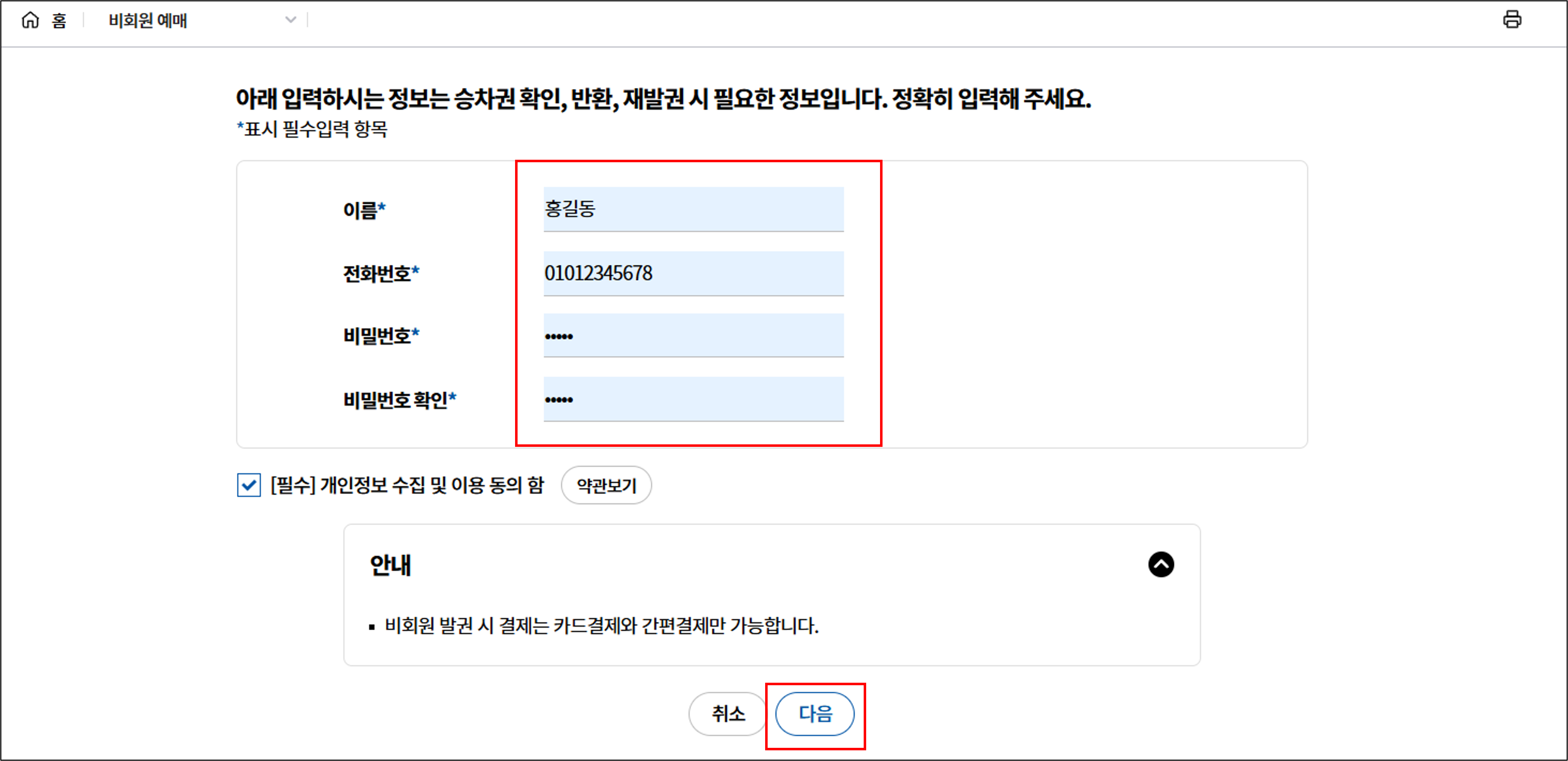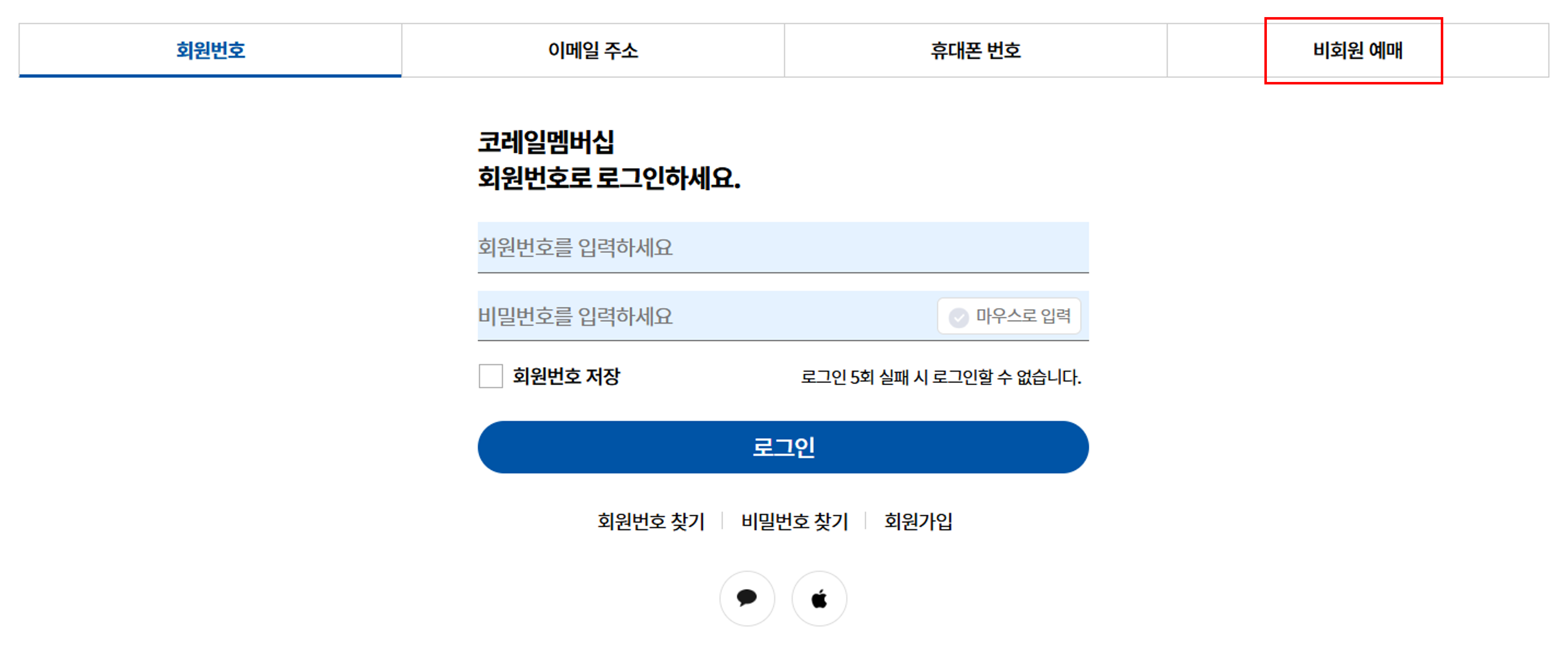 회원이 아닌경우, 비회원 클릭 후 예매하시는 분의 정보를 입력