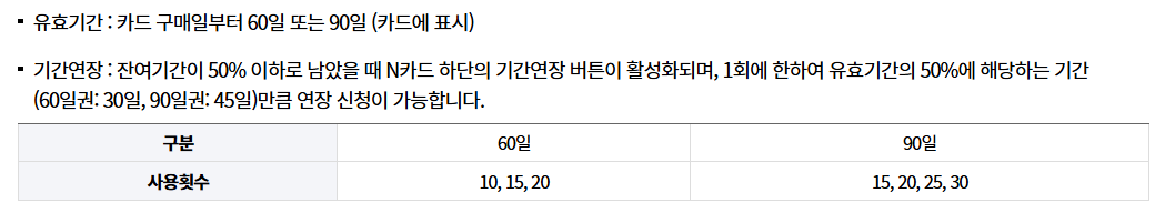 - 이용 방법: 이용횟수와 이용구간을 선택한 N카드 구매 후, 유효기간 내에 주중, 주말 구분 없이 열차 출발 전까지 할인승차권을 구매하여 이용